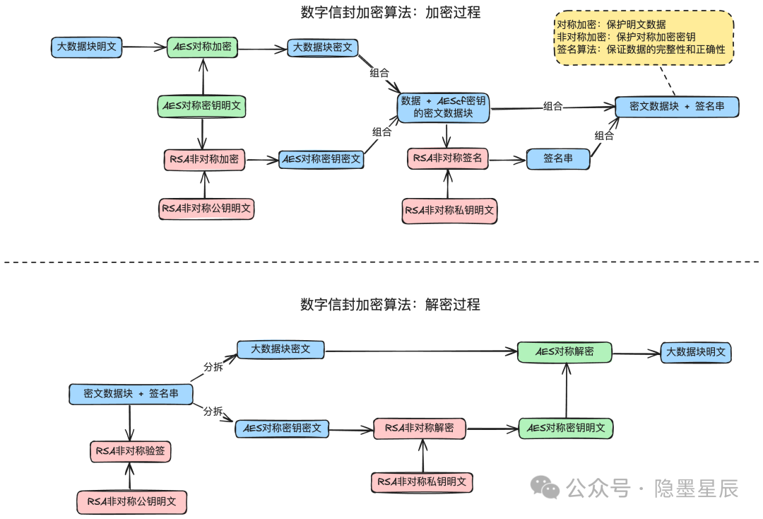 它的原理是使用对称加密算法对要传输的数据进行加密,然后再使用接收方的公钥对对称密钥进行加密,再使用自己的私钥进行签名,最后将加密后的对称密钥和加密后的数据一起发送给接收方。接收方先使用对方的公钥进行验签,再使用私钥解密对称密钥,最后使用对称密钥解密数据。