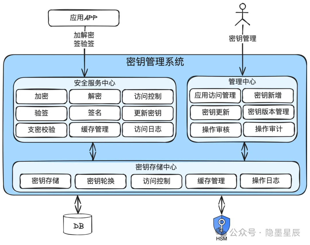 需要使用硬件加密机HSM生成并保存主密钥。工作密钥被主密钥加密后,保存到DB中。各应用调用密钥管理系统进行加密解密、签名验签,保证密钥不被业务应用读取,减少泄露风险。大数据块通常采用对称加密算法,一般是AE 128或AES 256。比如大段的报文。
