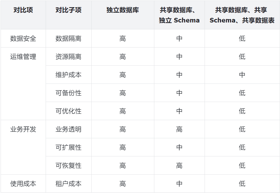 独立数据库:一个租户独享一个数据库实例,提供最强的分离度,租户数据彼此物理不可见,备份恢复都很灵活;共享数据库、独立 Schema:将每个租户关联到同一个数据库的不同 Schema,租户间数据彼此逻辑不可见,上层应用程序的实现和独立数据库一样简单,但备份恢复稍显复杂;共享数据库、共享 Schema、共享数据表:租户数据在数据表级别实现共享,提供最低成本,但引入了额外的编程复杂性,备份恢复也更复杂。