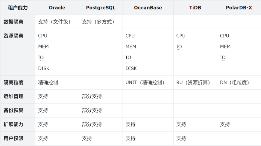 开发复杂问题。原模式中通常需要引入租户ID的概念,在行级增加标识来区分,这对于业务研发是不太友好的,需要在中间件层面最好屏蔽,让业务研发回归到租户内,不用感知到租户信息。跨机分布式事务。有时是需要提供跨租户的数据访问,这意味着业务需要做很多额外的应用改造成本,才能尽量来避免跨机事务导致业务出现报错。可通过中间件层提供强一致分布式事务能力来解决这一问题。元数据一致性。当使用跨Schema或共享数据表的模式,都面临操作所有租户对象同时生效问题。比如在 MySQL 的建删表、加减列、加减索引等常见的DDL操作,需要中间件能力来保证平台所有租户的表能同时生效,一旦执行中断,可以自动回退,无需人工介入来订正。租户数据迁移。当租户发展壮大后会面临资源不足需要迁移等情况,此时就需要针对租户提供数据迁移能力,与底层资源层解耦,实现按需使用。这部分维护成本很高,中间件可提供此能力便于在租户层面进行迁移。有很多数据库已经内置了多租户能力,用户可很方便地基于此快速开发 SaaS 类应用。下面简单对比下: