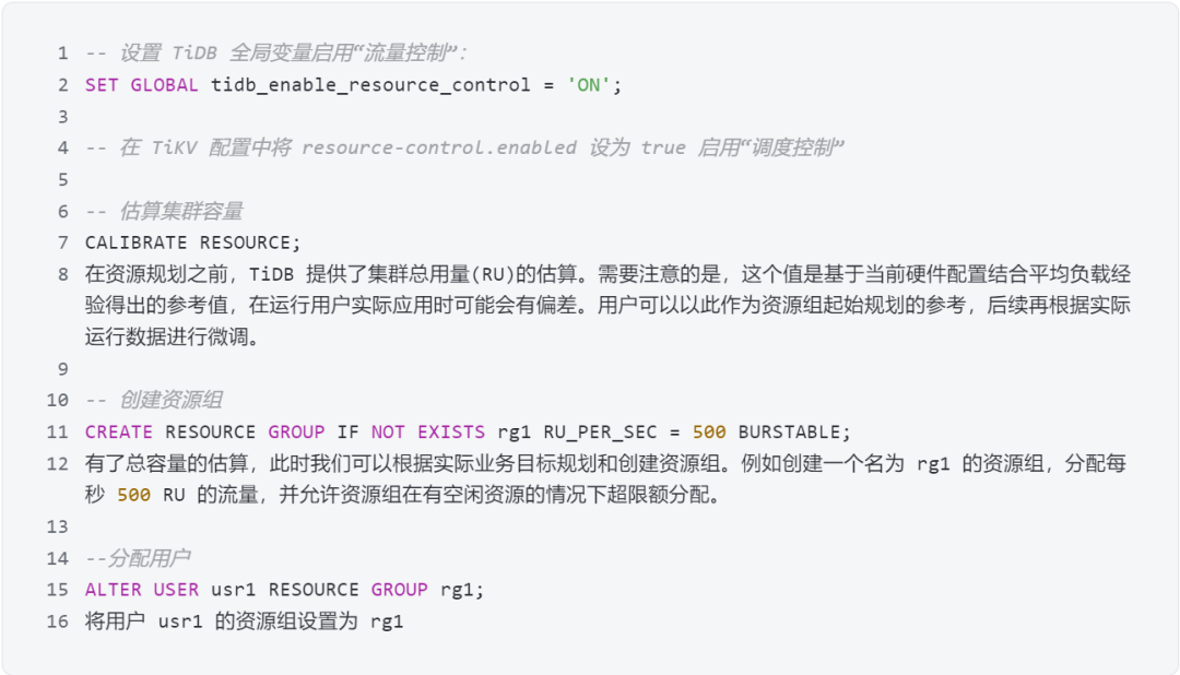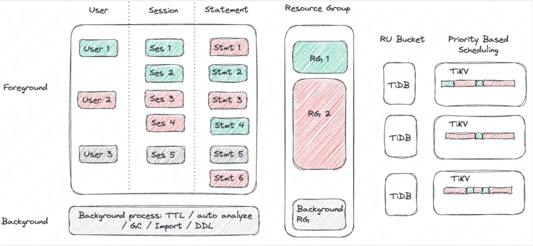 TiDB 采用了双层资源管控机制来实现更精确的管控。“流量控制”模块控制资源限额,确保仅在限额内的操作才能得以执行;“调度控制”模块则对队列中的任务设置不同的优先级,以确保在负载剧烈变化或超负荷运行时,高优先级的任务能够得到快速反馈。TiDB 资源管控特性提供了两层资源管理能力,包括在 TiDB 层的流控能力和 TiKV 层的优先级调度的能力。将用户绑定到某个资源组后,TiDB 层会根据用户所绑定资源组设定的配额对用户的读写请求做流控,TiKV 层会根据配额映射的优先级来对请求做调度。