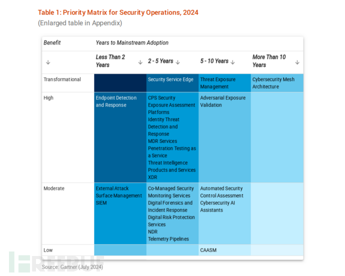 Gartner 根据对企业产生的价值以及技术的目标市场覆盖度,对这些技术进行了应用优先级评估,从而帮助企业安全或信息负责人制定安全战略路线,在恰当时间做出更明智的投资决策。