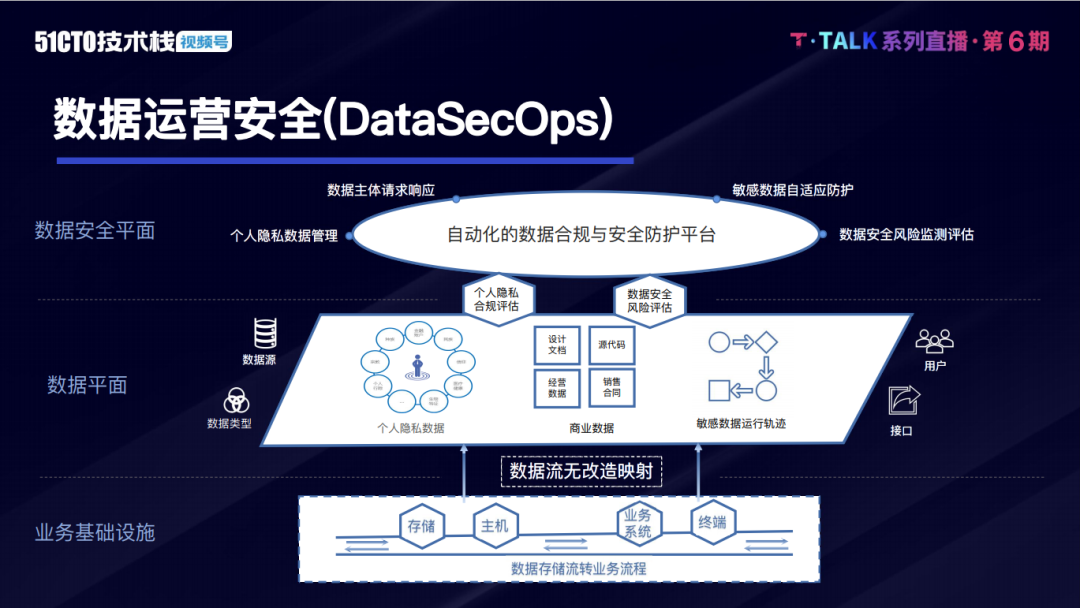 DataSecOps将IT分为了三个平面,第一个平面是基础设施,包括存储、主机、各类业务系统以及终端。在这一过程中我们可以看到数据存储流转的业务流与数据流。