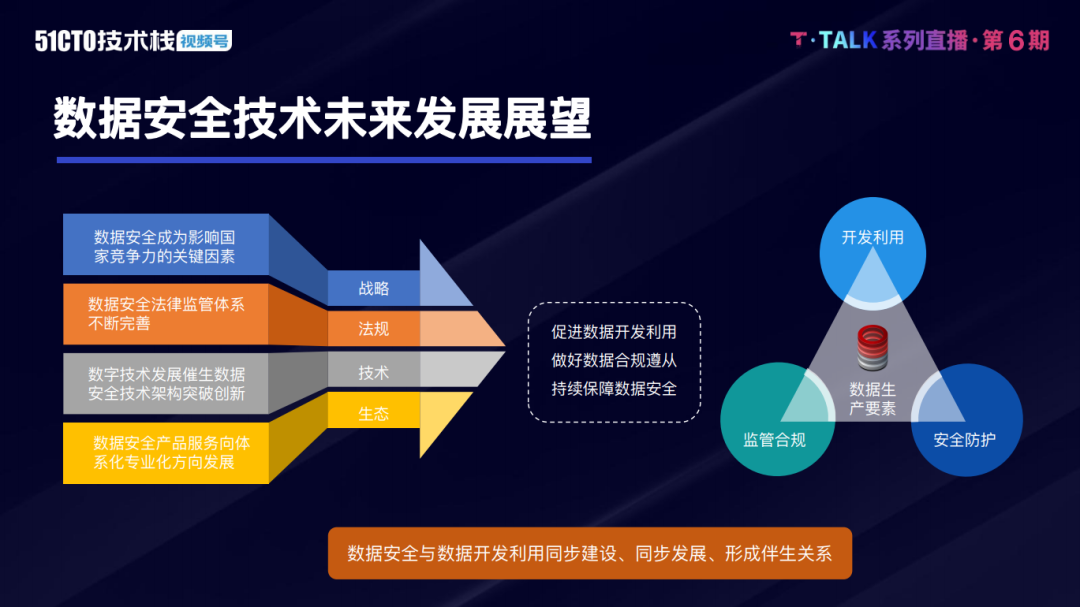 数据安全与数据开发利用,是同步建设的伴生性关系,数据安全是难以单独生产的,安全永远是一个保镖的角色,是一个辅助的、伴生性的维度。一定要服务于主体,也就是数据的开发和利用,这也是未来永恒的主题。从国家提出这一生产要素,从企业认知这一要素,从我们全球竞争的视角看到这一要素,最终,这一要素融将入我们的血液,与劳动力、资金、土地等共同成为人类的基本共识。