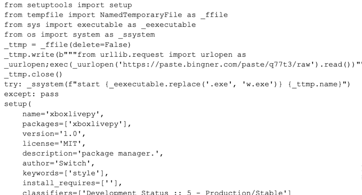 当软件开发人员想要使用Python包时,他们必须执行两个操作。第一个步是安装包,第二个步是在代码中导入或声明以使用它。正如接下来讨论的那样,攻击代码实际上是从安装文件(setup.py)中开始的,这意味着在安装包期间已经执行了攻击。