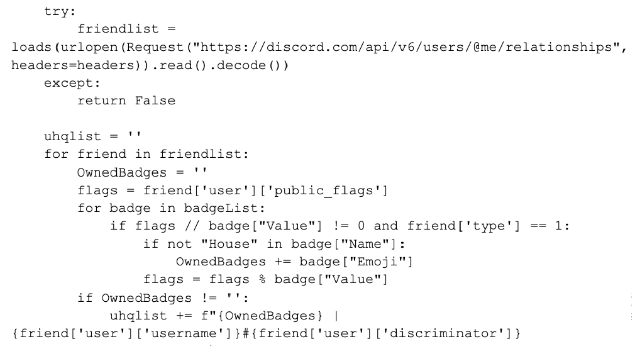 在下图中,攻击者与Discord API交互,以检索用户的好友列表并提取有关他们自己的标识信息。