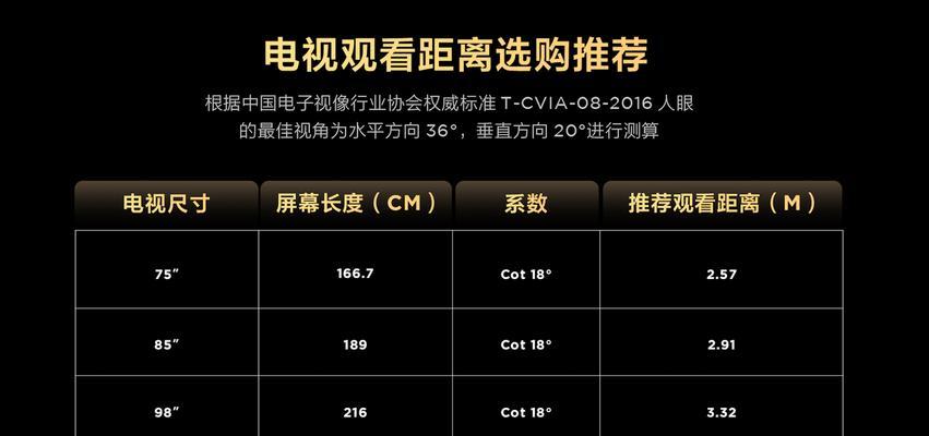 4.掌握电视尺寸与观看距离的比例关系:详细介绍电视尺寸与观看距离的比例关系,以便读者能够根据自己的观影需求选择合适的电视尺寸。